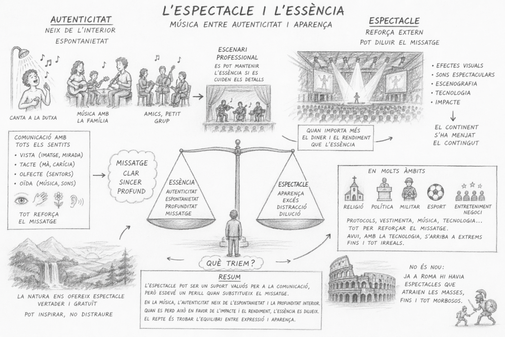 L’espectacle doncs pot enriquir la comunicació quan acompanya el missatge, però el desvirtua quan el domina. En la música, l’autenticitat neix de l’espontaneïtat i la profunditat interior. Quan aquestes es perden en favor de l’impacte i el rendiment, l’essència musical es dilueix. El repte és trobar l’equilibri entre expressió i aparença.