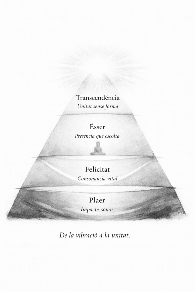 La música i l’art coneixen profundament aquests quatre nivells. Podem experimentar plaer escoltant una melodia agradable o sentir-nos feliços quan la música acompanya una celebració, una dansa, una cançó popular o un himne. En aquests casos, l’art funciona com un element utilitari o contextual: ens anima, ens uneix, ens fa companyia. Però la música pot anar molt més enllà. Quan l’escolta és profunda i tots els elements sonors convergeixen cap a una unitat expressiva, la música esdevé una via d’accés al sentiment d’ésser: toca el “jo” profund i el desperta. I, en determinades circumstàncies, pot fins i tot provocar la transcendència. Les consciències s’alineen, el temps es suspèn, i hom té la sensació de formar part d’un únic organisme sonor. És una forma d’espiritualitat laica: la unitat a través del so.